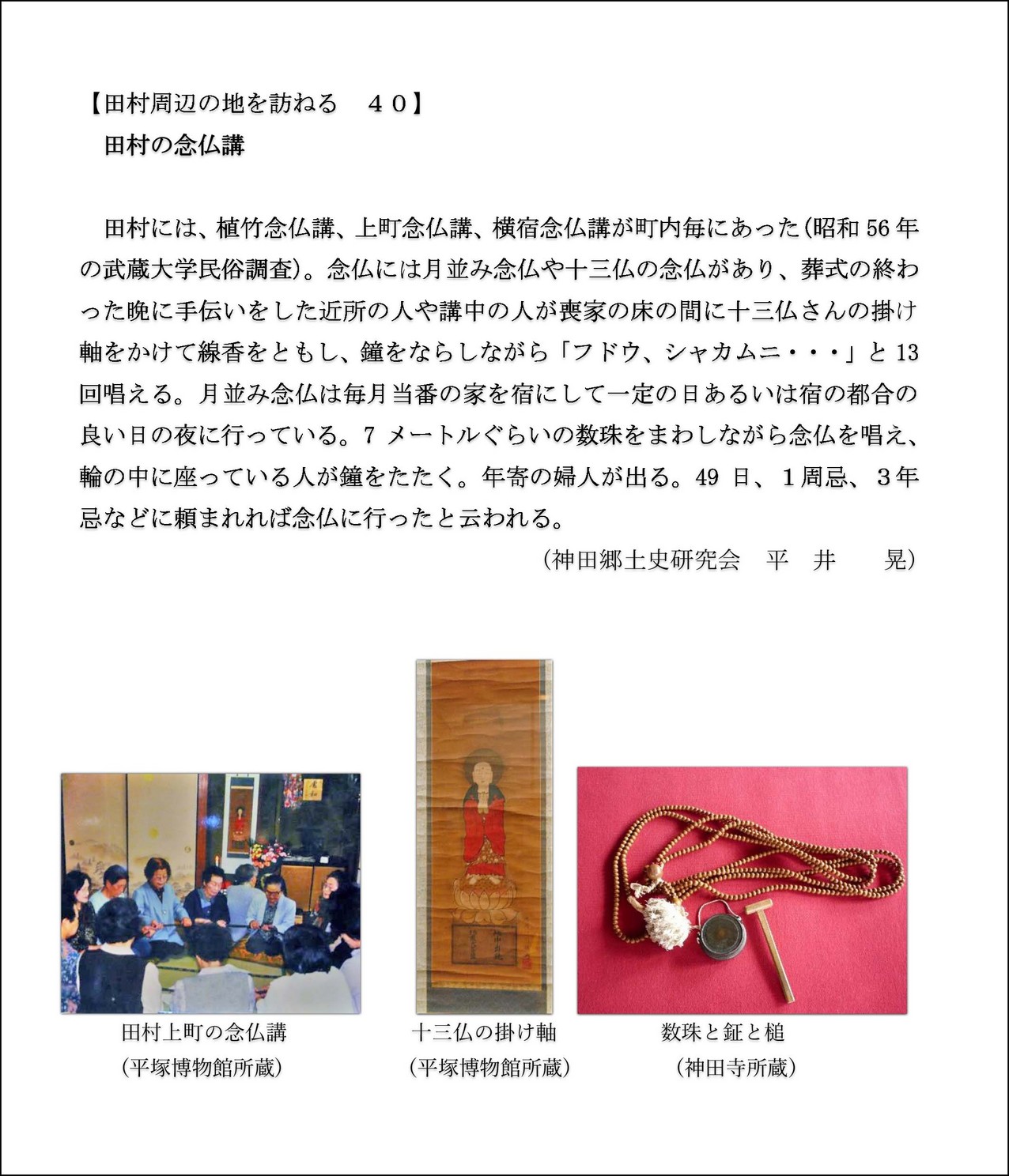 田村は平塚市の北東部・相模川沿いに位置し、西に富士・箱根・丹沢・大山を望む風光明媚な地域です。又、南北に国道129号が通り、自動車販売店・大型電器店・大規模商業施設等で賑わっています。古くは、田村通り大山道、八王子往還の継立場として繁盛し、更に「田村の渡し場」があり、交通・物流の要所として栄えていました。無形文化財の田村囃子と印場踊りや、鎌倉武将・三浦義村館跡等の旧跡もあります。明治22年に神田村となり、昭和31年に平塚市と合併し自治会活動、福祉活動、その他各種団体の地域活動も盛んです。地区には平塚市の聖苑(火葬場)があり市民生活に役立っています。
