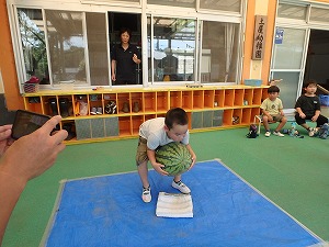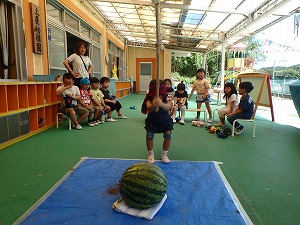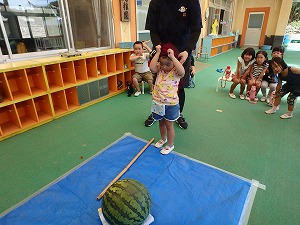 夏休みが終わり、園に元気いっぱいの子どもたちが帰ってきました。 先生や友達との再会を喜び、汗びっしょりになって楽しく遊ぶ園児たち。 そんな園児のもとに、地域の方から大きな大きなすいか🍉をいただきました。 「うわぁ 大きい〜!」と大盛り上がり。 あまりの大きさに、すりすり撫でて抱きしめる子もいます。 「食べたい!」「すいか割りしてみたい」との要望がありました。 「すいか割りやったことある?」と先生が子ども達に質問するとほとんどの子が経験したことがありませんでした。 やってみたいけど、やったことのなかったすいか割り。 子ども達は始まる前から大興奮。 すいか割りをする前にの重さを量ってみると11kg!! 「持ってみたい」と何人もの子が持ち上げるのに挑戦していました。 さぁ〜すいか割りのスタートです。 目隠しをして棒を持つ友だちに「がんばってね」と応援する友だち。 歩き始めると 「まえ、まえ」 「みぎ、みぎ」 「右ってどっちだっけ?こっち?」 「そう、そっちに1歩」 など、声を掛けていました。 すいかに棒が当たる子も当たらない子もいましたが、みんなで楽しい時間を過ごしました。 そして最後には、包丁で切ったすいか🍉をみんなでたくさん食べました。 夏の素敵な思い出がまたひとつ増えました。ありがとうございました。 |