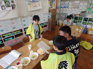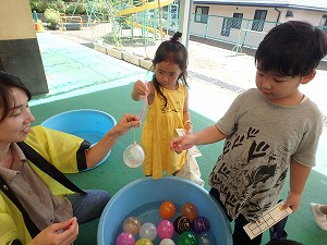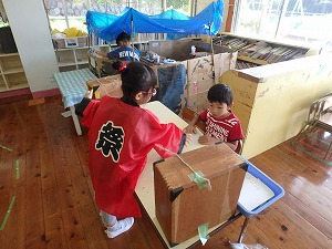 8月のお誕生会後、誕生児の保護者の方々に手伝っていただき、夏祭りを行いました。 夏祭りコーナーは、ヨーヨー釣り・的当て・輪投げ・お菓子釣り屋さん。 先生と保護者のお母さんがお店の人になり、園児がお客さんとして各お店を回りました。 「いらっしゃいませ、ヨーヨーはいかがですか?」 「やらせてください!!」 やりとりを楽しみながら全てのコーナーを周り終えた子ども達。景品をたくさん持って満足そうでした。 その日の午後、自分たちで「お祭りのお店をやろう」とお祭りごっこが始まりました。 ストローや毛糸で作ったわたあめ屋とラーメン屋、夏祭り遊びで使用した釣り竿を使った魚釣り屋、毛糸や画用紙、その他の素材を使って再現した焼きそばや焼き鳥を売る店など、何人かの仲間でそれぞれお店を始めました。 品物を作り、メニューを準備するお店もありました。 その後、「お金も必要だね!」と買い物をするために必要な物を自分たちで考え作る子も出てきました。 準備が終わると早速店開きです。 「いらっしゃいませ!」と元気な声が響きます。 園児は、お客さんになって他児のお店に行ったり、お店の人になってやりとりをを楽しんだり大忙しでした。 自分たちの体験したことを自分たちなりに再現しながら、今までの経験を加えて新しいお店や必要な物を考えていく子ども達。 様々な体験活動が子ども達の成長の糧に繋がっていくことを改めて実感しました。ご協力いただいた保護者の皆様、ありがとうございました。 |