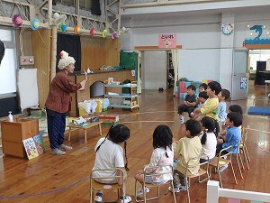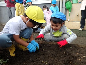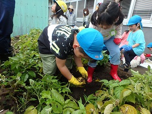 昨年度2月に卒園したお兄さん、お姉さんが植えたジャガイモが収穫の時期となりました。 この日は毎週水曜日の「ぽっかぽかの会」(子育て支援事業)。 遊びに来てくれたお友達と一緒にジャガイモ掘りを楽しみました。 軍手をはめていざ収穫作業!! 「うわー、たくさんついてる。」 「このジャガイモ大きい。」 「宝さがしみたい。」 子ども達は夢中になって掘り出す活動を楽しみました。 虫が大好きなお友達は、偶然見つけた昆虫の幼虫に大興奮!! 15分ほどの作業でたくさんのジャガイモが採れました。 さっそくふかし芋にして試食。 子ども達の嬉しそうな顔。 自分たちで採ったジャガイモの味は最高だね。 |