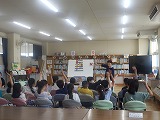本日1年生と6年生が、図書室で算数の学習をしました。1年生の課題は「何番目のマスターになる」です。ゴールはプリントを解くことでしたが、急遽6年生が作った問題を解くことができるになりました。6年生の目標は「小数と分数が混じったかけ算の計算の仕方を理解する」です。ノートを使って解き方の説明を学び合いました。
