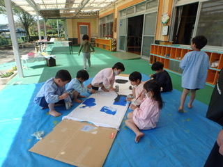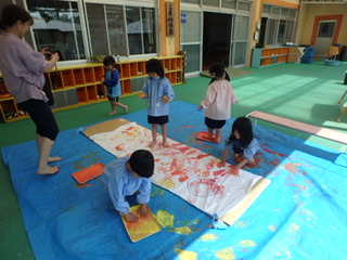 早速、職員でアイディアや特技を活かし、白いシーツを縫い合わせ、 その真っ白な鯉に、各クラスの子ども達が重い思いの色を塗り、
