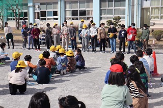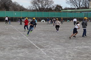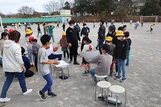 3/2(木)の長い昼休みに、5年生が企画した「6年生と楽しむ会」が校庭にて開催されました。朝も、そして、夕方も雨が降りましたが、お昼は良い天候に恵まれ、6年生を囲む行事を行うことができました。今回の企画は「しっぽ取りゲーム」です。スズランテープで作られたしっぽをつけて取り合うゲームです。チームは3チームあり、三つ巴の戦いとなりました。3チームは、赤チーム(6年生15+1名担任)、青チーム(1・4年34名)、紫チーム(2・3年26+1名担任)です。同時に始まり、しっぽを取られてしまった人は、5年生の所に行き、学校クイズにチャレンジします。3択で正解するとしっぽをもらって、復活することができます。「教室の数は?」「全校児童の人数は?」などなど。優勝は赤チームでした。少数精鋭でした。最後に、赤チーム一人一人から後輩たちへメッセージ、一言ずつ話をしてもらいました。たのしい時間はあっという間で短く感じました。
