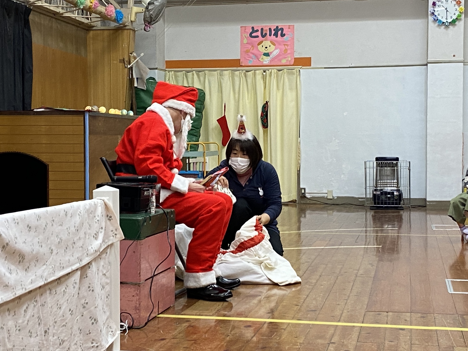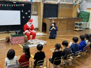 今年も園ではクリスマスをみんなで楽しもうと ♪リーンリーン・・・どこからともなく電話のベルが鳴り、見ていたプロジェクターにサンタさんの顔が映し出されました。 『今から会いに行くね、行ってもいいかい?(英語)』 「ぜひ来て下さい。みんなで待っています^0^」 振り返るとサンタさんが大きなプレゼントを持って現れました。 |