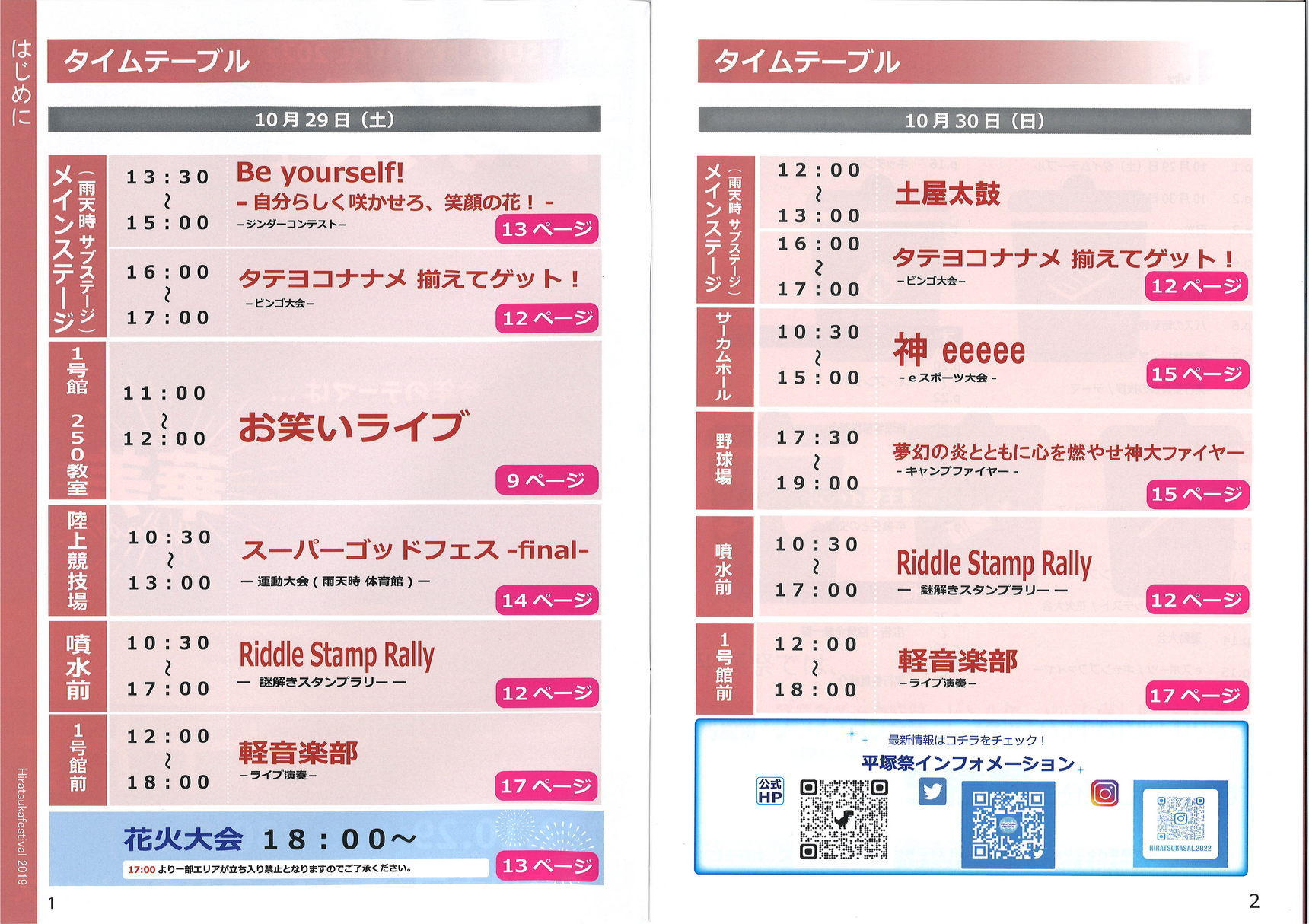 土曜日の18時からは花火も打ちあがります! 今年はなんと、土屋太鼓の披露も予定されています 10月30日(日)12:00〜13:00に土屋太鼓として、惣領分太鼓連、小熊太鼓連、遠藤原太鼓連、寺分太鼓連が叩きます! さらに1号館入口では、「ふるさと土屋いろはかるた」の展示も行われます 土屋での最後の学祭です!ぜひご来場ください 平塚祭の詳細はこちら |