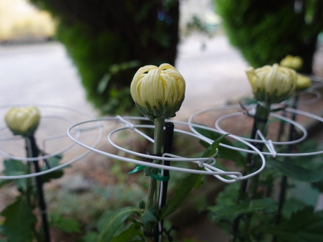 令和4年10月25日(火)、土屋小「菊づくり」の最後の工程「輪台付け」を実施しました。大分蕾が大きくなってきましたが、大菊は直径20cmほどまで大きくなります