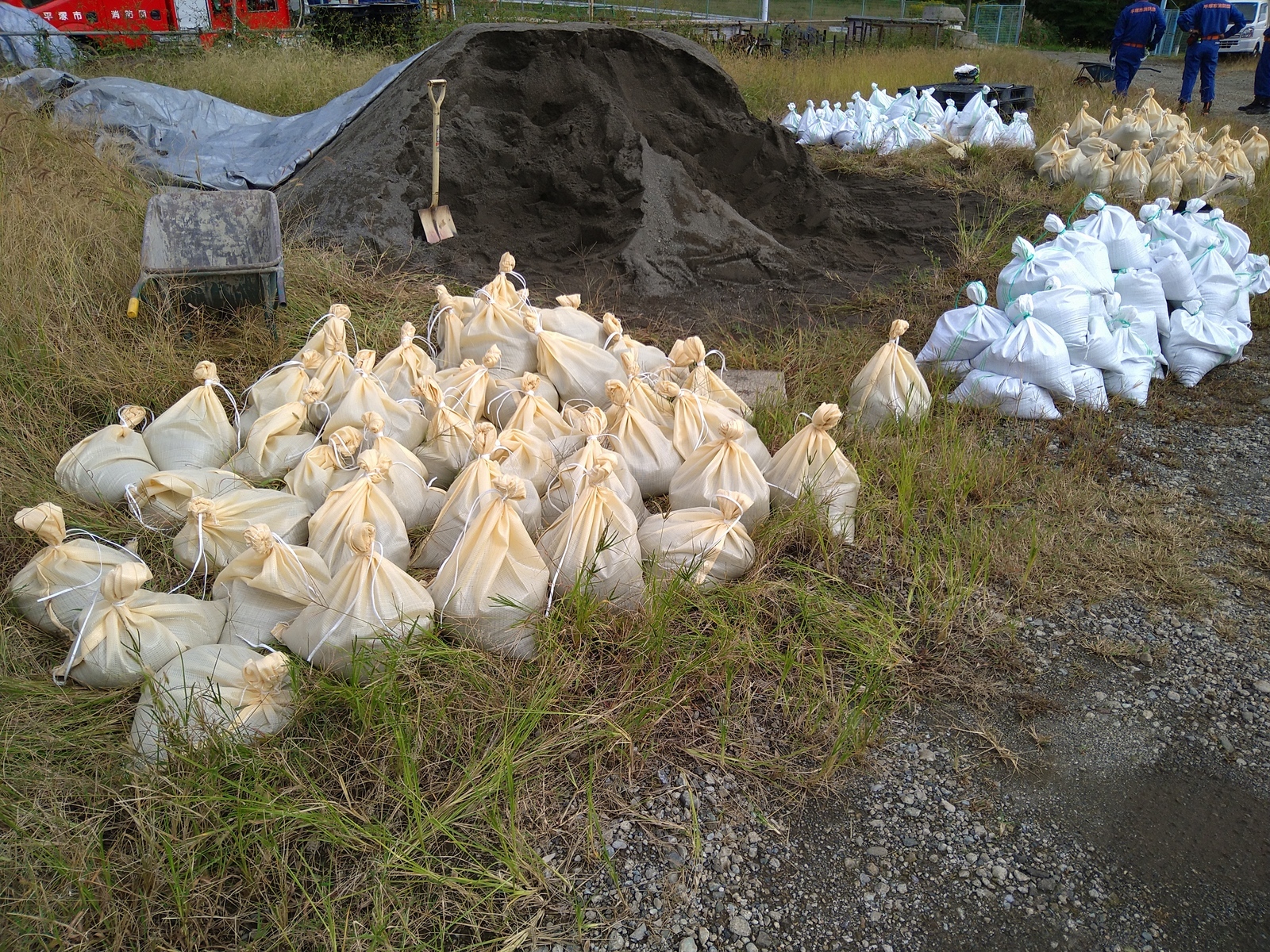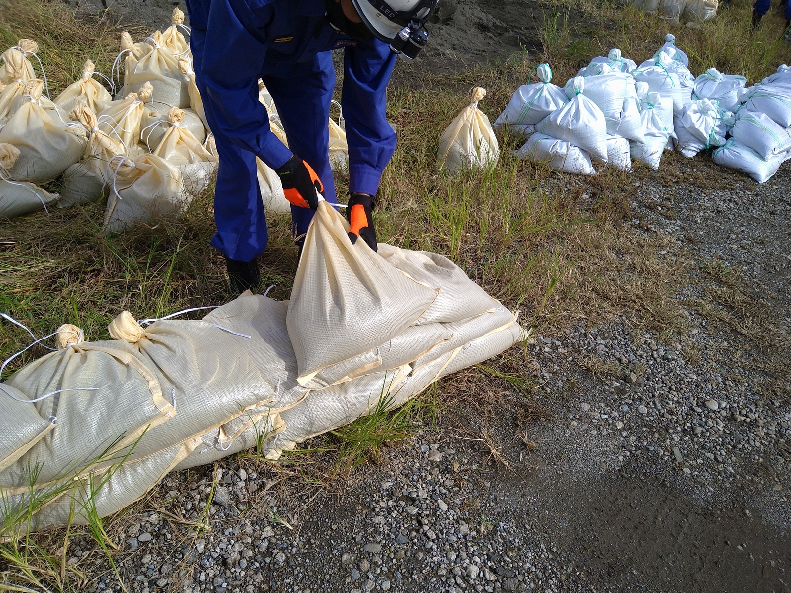 スコップで土を入れる人、袋を押さえる人、袋を結ぶ人の役割を3人でローテーションしながら各分団50個作成。これがまた結構きついんです。重すぎず軽すぎず丁度いいサイズにする感覚を経験できました! 土のうを楽に作成できる機器等は今回使わず、原始的な方法での基礎習得が目的です(笑) また作成後は積み方のレクチャーで、様々な積み方があり状況に応じて変えていくとのことで、今回は基本的な小口積みを教えていただきました。 増水などで浸水被害が無いことが一番ですが、万が一のときに備え被害を最小限に食い止められるよう、今後17分団でも訓練に取り入れていきたいと思います! |