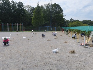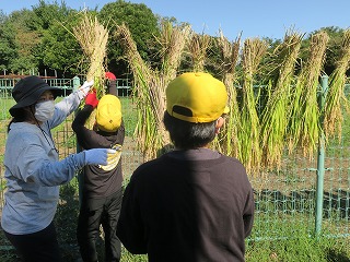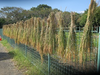 今年も、黄金に彩られた稲に育ちました。晴天の下、5年生16名全員で、稲刈り体験をしました。稲を刈ることよりも、この後、天日干しにするために、束にして縛ることの大変さを知りました。稲刈りが終わり、「やったー、終わった。後は学校(教室)に戻るだけ」という声。しかし、まだ、学校に戻って、天日干し作業が残っていました。収穫後の脱穀作業や精米作業など、まだまだ「いただきます」までの道のりの遠さをこれから知る5年生です。