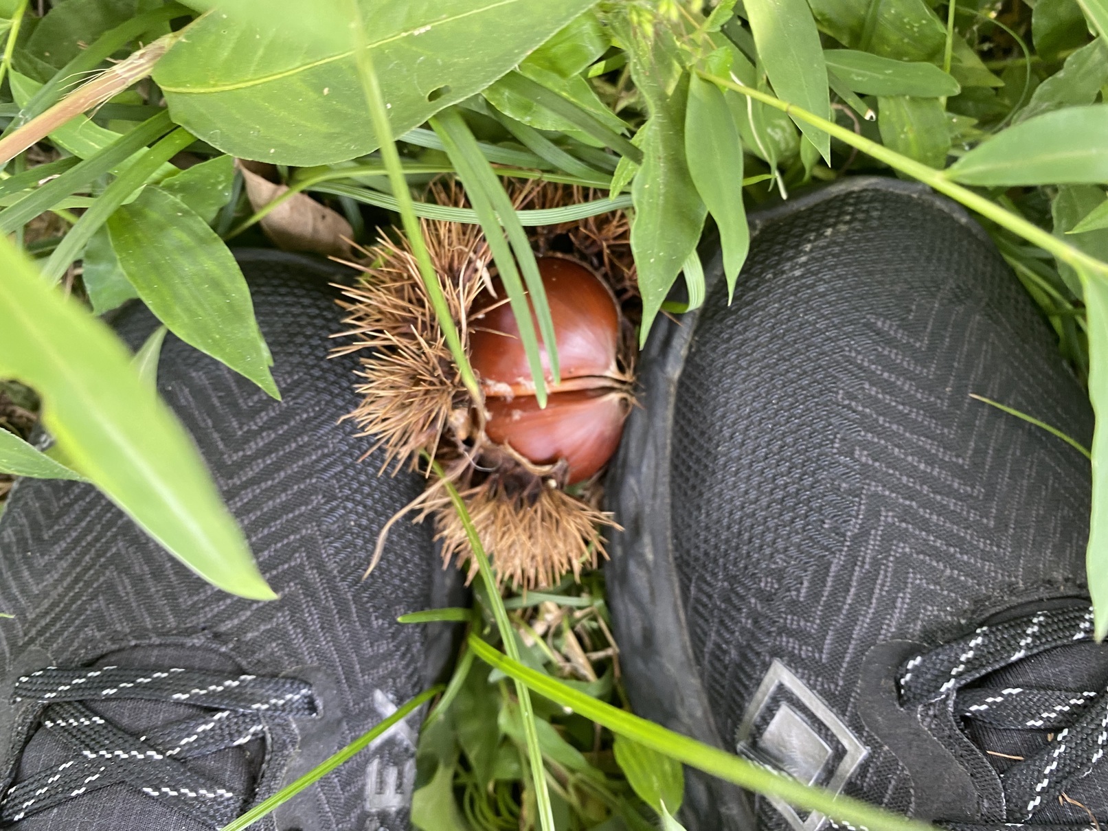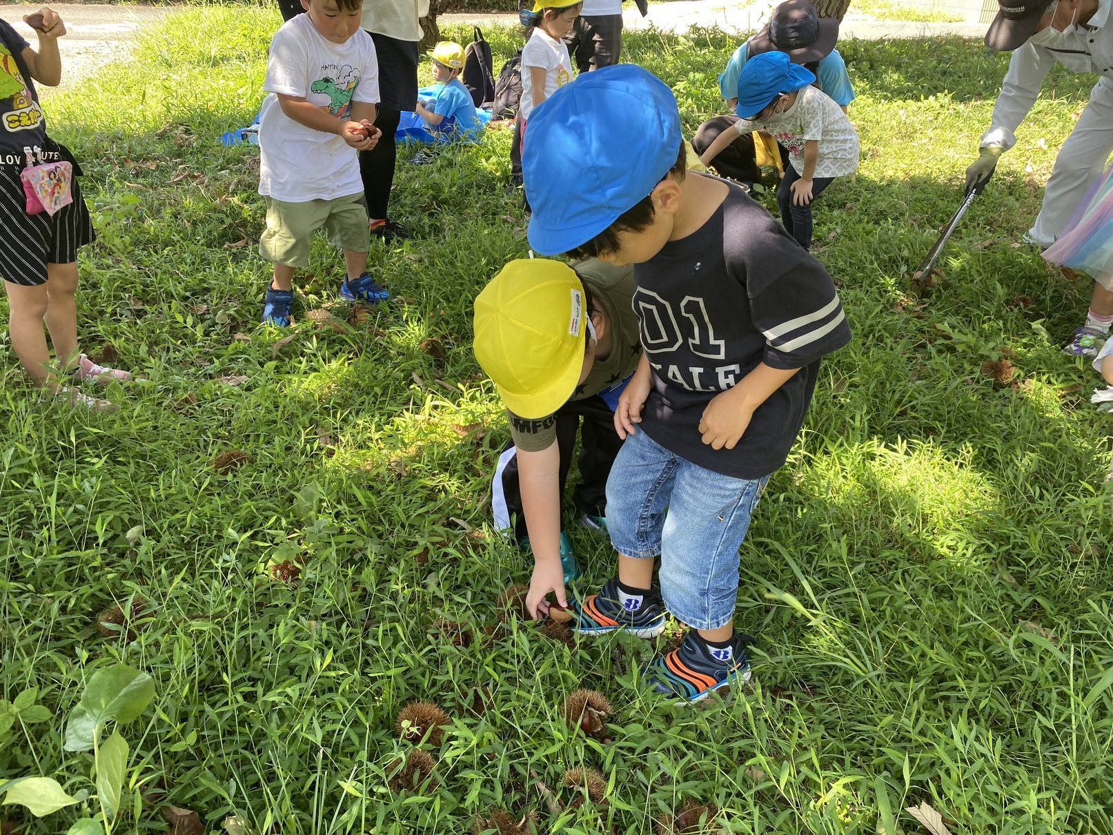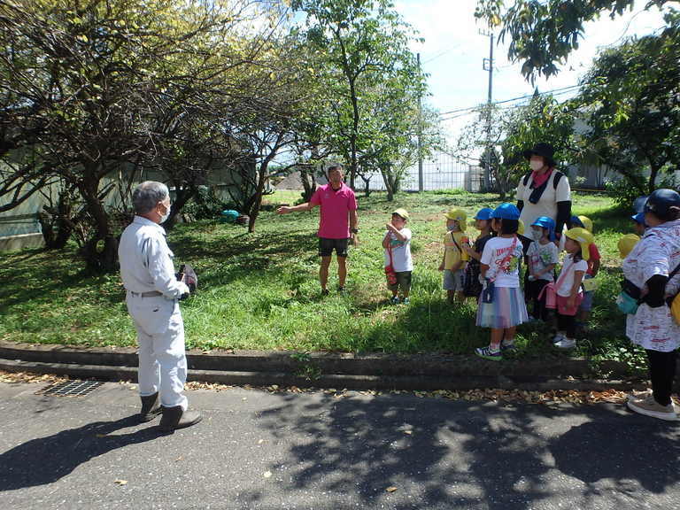 土屋地域は秋も魅力がいっぱい!!あります。 先日の9月12日、土屋公民館長さんの厚意で栗拾いをさせていただきました。 当日はとてもお天気。 子供たちは前日から栗拾いを楽しみにしていました。 栗林に着き、大きな栗の木の下には、いがのついた栗がたくさん落ちています。 「どうやって取ればいいの?」 「なんだかトゲトゲしてる!!痛そう」 とちょっと不安そうな子供たち。 そこで、館長さんから @誰でもできる栗の拾い方とA上級者の栗の拾い方を教えていただきました。 @誰でもできる栗の拾い方→草をかき分けて落ちている栗を探す方法。 A上級者の栗の拾い方→両足で挟むようにいがを押さえながら、足でひろげる方法。 早速一人一人の子供たちが、栗を探しはじめます。 「うわー、取れた!!」興奮した様子で拾い集める子どもたち。 その様子を見ながら一緒になって栗拾いを楽しむ園職員たち。 大きな栗の実がゴロッと転がり出てきた時の喜びはたまりません。 20分ほど夢中になって取り続けると、カゴいっぱいに栗を集めることができました。 帰りはみんなとても満足そうな表情でした。 この日の夜ご飯は多くの家庭で、栗ご飯や栗のデザートを楽しんだというお話を聞きました。 貴重な体験の機会をいただき、ありがとうございました。 |