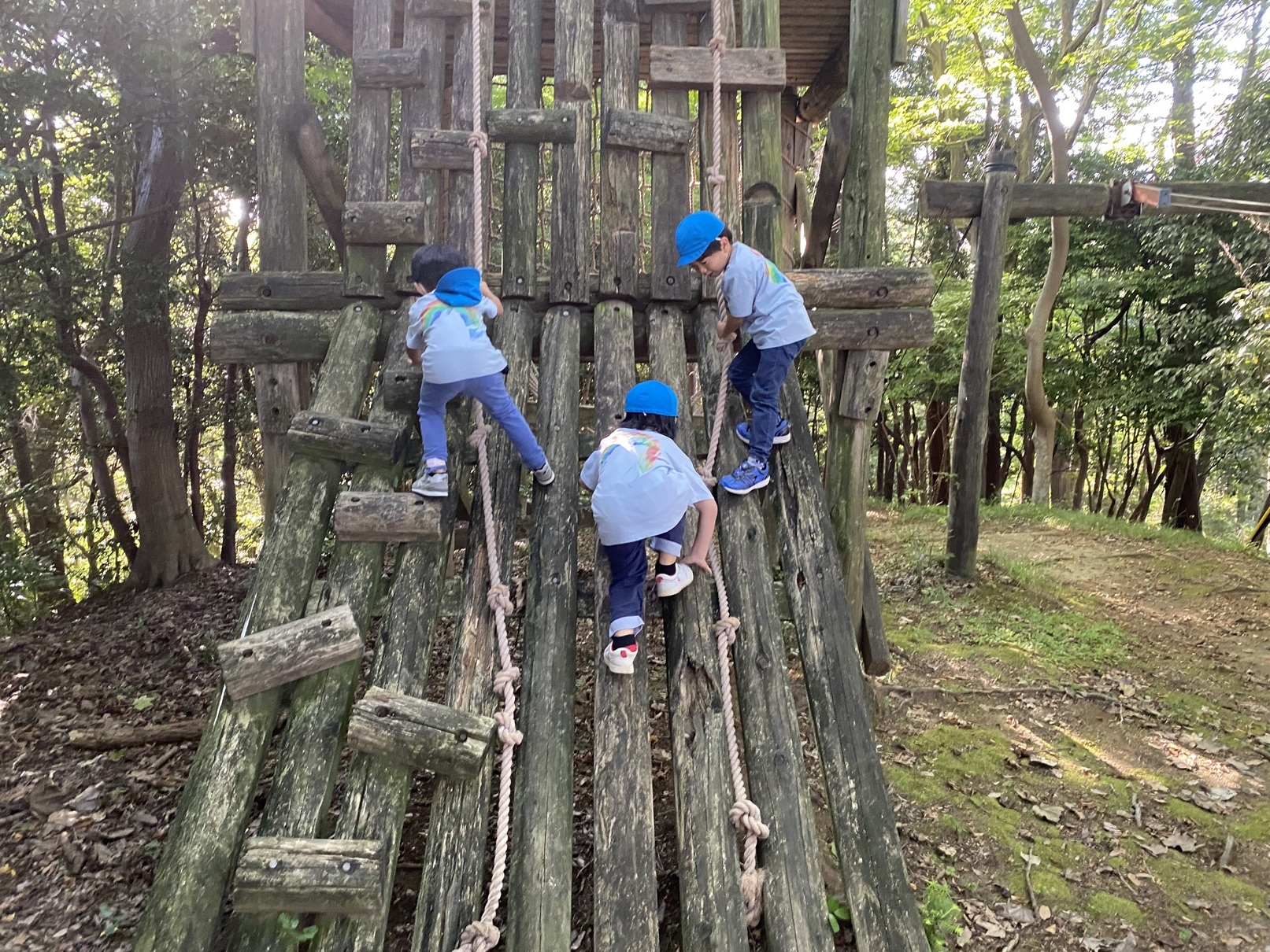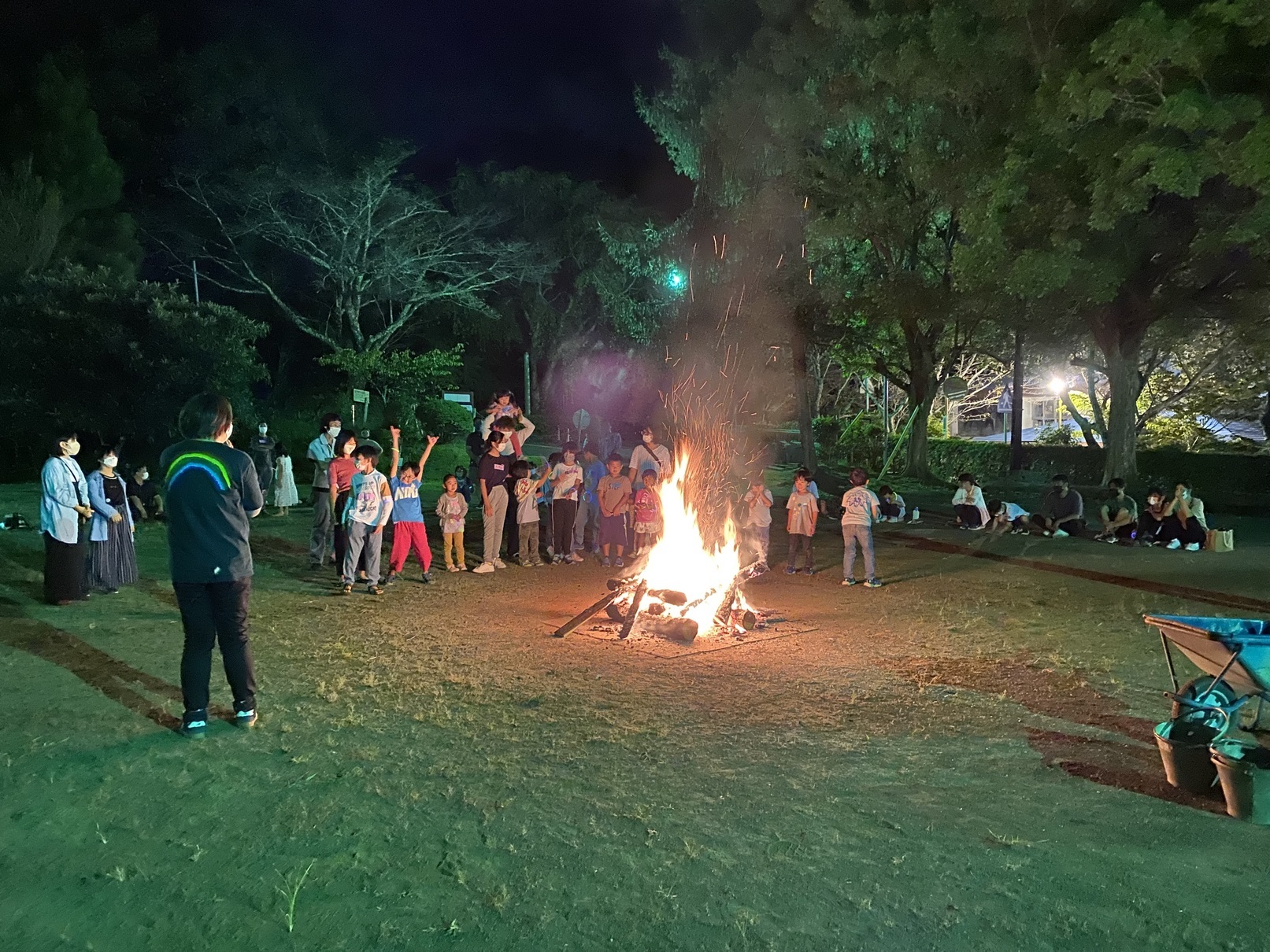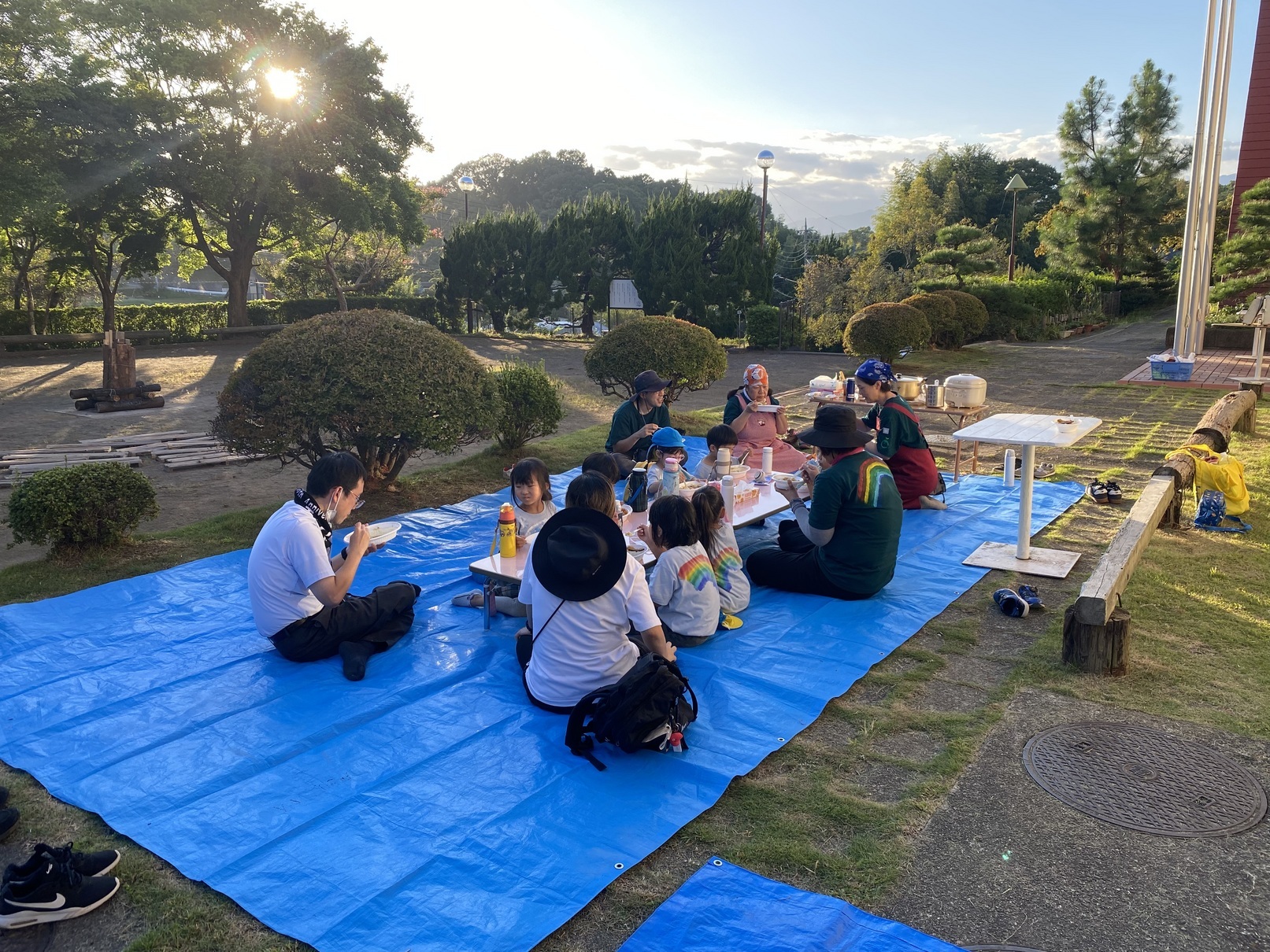 土屋幼稚園では幼児期の直接体験する機会を大切にしております。 今年度は、年長児クラス(すみれグループ)の特別な活動として、年長児だけで過ごす保育と野外行う自然体験活動を楽しんできました。 今回の活動では「仲間意識や絆を深める」「友達と意見を出し合いながらすすめて行く過程を楽しむ」ということをねらいに、2週間ほど前から話し合いを重ね、準備をしてきました。 その内容は、子どもたちの希望から「お揃いのTシャツ作り」を作り、当日は「カレー作り」「宝探し」等、子供たちの「やってみたい!!」をプログラムに取り入れました。 びわ青少年の家は本園から10分ほどの場所にあります。 ここは、自然体験活動や野外炊事活動、アスレチックなどの体験活動を楽しむことができる素晴らしい施設です。 午後から集まった年長児は、まず最初に夕ご飯のカレーに入れる野菜の調理を行いました。 これまで色々な野菜を育て、調理してきたのでこの日も主体的に野菜を切っていく年長さん。あっという間に下ごしらえを終えると、元気いっぱいに外のアスレチック場に飛び出して行きました。 アスレチックは子供たちにとってとても大きく、難しいコースでしたが、試行錯誤しながら個々に挑戦する姿が見られました。 初めは怖がってみていた子も友達の取り組みに刺激を受け、何度もチャレンジしていました。 「いつもマラソンやってるからできるよ」 「ちょっと怖いけどやってみる!!」 「ここを持つと上りやすいよ」 友達同士助け合い、協力し合う場面がたくさんありました。 この日だけでも大きな成長が見られました。 また、夜18時からは在園児や卒園児の家族も集い、「キャンプファイヤー」を楽しみました。 普段の生活の中では体験することができない大きな炎を見ながらみんなで歌を歌ったり、ダンス、ゲームをして楽しみました。 「こんなに火ってあったかいんだね」 「はじめて火の粉を見た!!」 子どもたちは興奮した様子で顔を見合わせていました。 今回はとても貴重な体験の場を提供していていただきましたびわ青少年の家の職員の皆様、ありがとうございました。 |