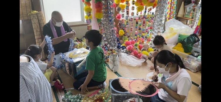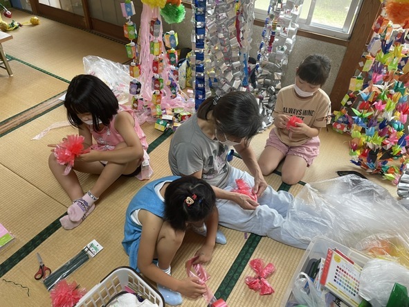 6月から週末に集まって飾りを作成しました。 子どもも大人も一緒になって協力的で楽しく作業ができ、 絵を描く子、大人の横で黙々と作業をする子、大人と笑いながら お手伝いをする子など笑い溢れる作業風景でした。 竹に飾り付けたのは7月7日の七夕の日。 飾り付けは高所のため大人が中心となって飾り付けました。 (上惣領子ども会役員さん談) 大きく立派な竹飾り 気合いの入りようがうかがえますね。 |