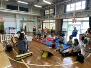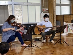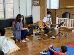 7月6日の子育て支援事業「ぽっかぽかの会」では会の後半に演奏会を行いました。 演奏者は伊藤真澄海さん(バイオリン)と伊藤コウタさん(ギター)。 お二人は「親子や小さな子供たちから大人まで気軽に生の音楽や楽器に親しめる機会をつくりたい」との思いを持っていられ、ご縁があって土屋幼稚園に来ていただける事になりました。 コンサートを行うにあたってお二人から 「好きな場所でゆっくり音楽を楽しんでね。音楽を聴いて楽しくなったら自由に体を動かしたり、歌ったりしてね♪」との話がありました。 お二人の優しい語り口調や振る舞いに会場のホールはアットホームな雰囲気に包まれました。 曲の合間に楽器の紹介や曲の紹介のトークを挟みながら終始リラックスした雰囲気の中、演奏会は進んで行きました。後半はリズム感のあるノリの良い曲が用意されていて、気がつくと子どもたちも私たちも、立って体を動かしながら音楽を楽しんでいました。 音楽って素敵ですね。 今回の演奏会は演奏者との距離がとても近く、音の響きを直接身体に感じることができました。素晴らしい本物の演奏を生で聴くことができた貴重な時間でした。 伊藤家ご夫妻、本当にありがとうございました。 内容は 0、前奏曲(作曲 伊藤コウタ) 1、星めぐりの歌(作曲 宮沢賢治) 2、にじ(作曲 中川ひろたか) 合間に七夕の歌もみんなで歌いました 3、Under the sea(作曲 Menken) 4、Butter (作曲 RM他) 5、群青(作曲 Ayase) 〜アンコール〜 |
