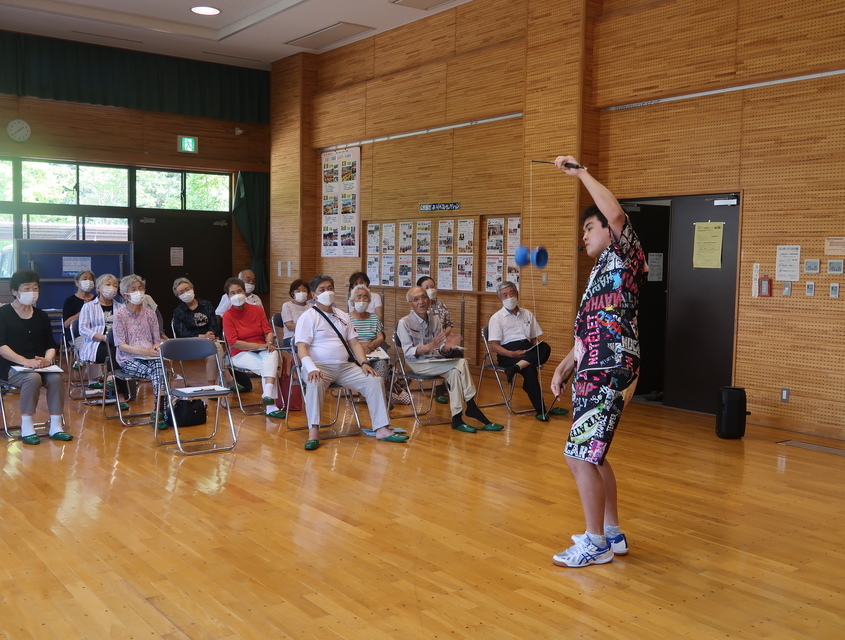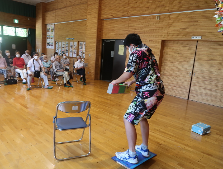 令和4年6月28日(火)、土屋はつらつ学級の第6回「大道芸パフォーマンス」を実施しました。昨年の土屋っ子ふれあい鑑賞会で大好評だった地元の大学生大道芸人INOをお呼びし、大道芸を披露してもらいました。