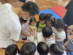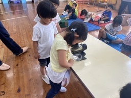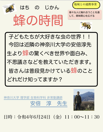 土屋幼稚園では地域の様々な人との触れ合いを通して、知ること、感じることを大切にしています。 本日、近隣の神奈川大学 理学部 生物科学科 講師の安倍 淳先生をお招きし、 「蜂🐝の時間」と題して、蜂に関するたくさんの話を聞かせていただきました。 話が始まる前は「蜂は刺すから怖い」と不安そうな子どもたち。 それでも安倍先生から蜂の種類や生態について動画や成虫になる前の生きた幼虫を見ると、蜂に対して自然と蜂に対して興味を持ち始め、 「なんでこんなに大きい巣を作れるの?」 「何を食べてるの?」 「蜂蜜はある?」などなど たくさんの質問が上がってきました。 安倍先生は一人一人の声に丁寧に耳を傾けながら応えてくださいました。 その後もドキドキしながら蜂の巣に触れてみたり、顕微鏡で覗いてみたり、園内の蜂の巣を観察したりしながら関心を深めていました。 これまで土屋幼稚園でもたくさんの蜂を目にしてきました。 それでも今日蜂の話を聞いて、また蜂を見る目が変わったように思います。 これから夏から秋にかけて子どもたちはたくさんの虫や小動物に出会います。 今日の蜂の時間で感じた思いがが、これから出会う「生き物への興味関心の広がり」につながっていく一つのきっかけになると嬉しいです。 安倍先生、本日は素敵な講義、ありがとうございました。 |