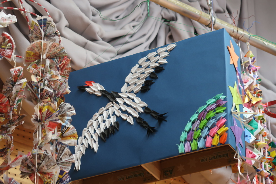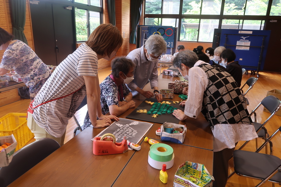 今年は、昨年地域の皆さんが作ってくれた折り鶴を貼り付け、鶴と亀の七夕飾りを作りました 七国荘の石黒さんにアドバイスしてもらいながら、折り鶴を並べ、見事な鶴と亀が出来上がりました。裏面には、千年、万年の文字を並べ、色を変えたり、折り鶴を付け加えたりと、みんなで和気あいあいとアイデアを出しながら作りあげました 出来上がった竹飾りは、湘南ひらつか七夕まつりの竹飾りコンクールの審査日に合わせ、7月7日(木)の9時30分から他の利用団体やサークルの皆さんが作った竹飾りとともに、公民館の前に掲出します。 |