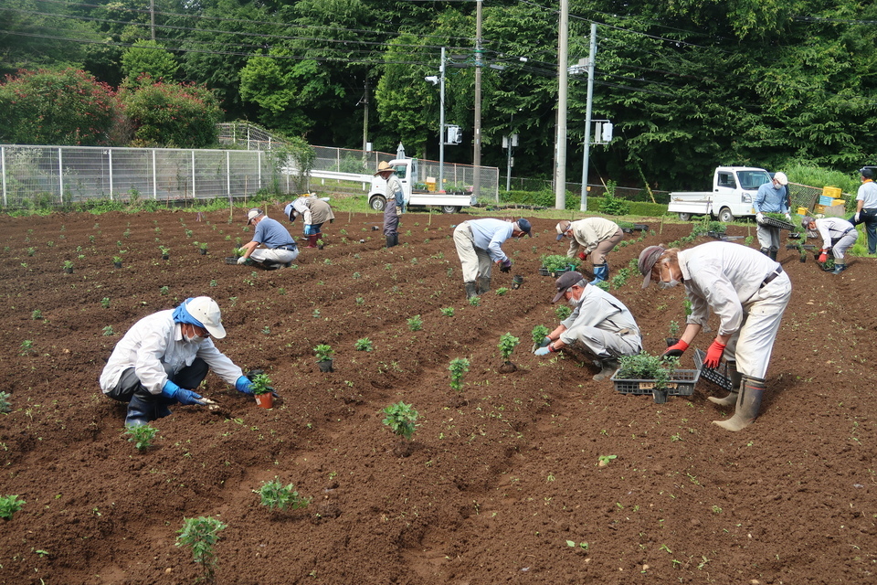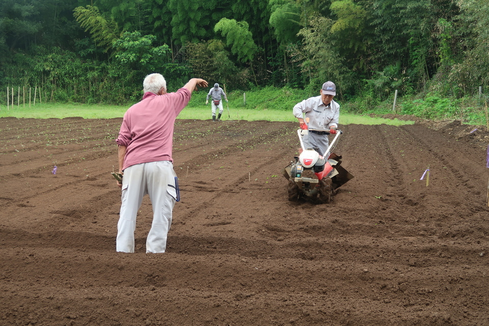 今年も土屋菊づくり愛好会、土屋小学校、土屋公民館で土屋ざる菊園を整備します。雨天により延期となっていましたが、6月18日(土)にざる菊園の耕うんをし、19日(日)に会員総出で植え付けを行いました。