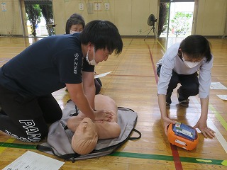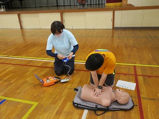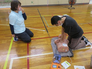 本日、体育館にて、心肺蘇生校内講習会を実施しました。土屋幼稚園からも2名の先生が参加しました。訓練用レサシアン及び訓練用AEDをお借りしてきました。119番通報する、AEDを持ってくるなどの役割を交代しながら実技を中心にAEDの装着とコロナ禍なので胸骨圧迫等を練習しました。