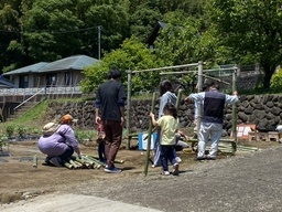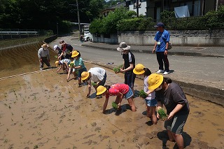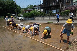 昨日(5/30)の3・4校時に、5年生が田植え体験をしました。学校からサンダルで移動して、すぐそばの田んぼへ向かいました。田んぼへは素足で入ります。今年は気温も上がり、「あったかい」と言いながら入っていきます。「おたまじゃくしがいる」など、自然を体験しつつ進めます。前半後半に分かれ、苗を植えていきます。5年生の中には経験者もおり、手慣れたしぐさで次々に苗を植えていきます。しかし、それは少数派、ほとんどの5年生は初心者です。泥に足を取られてふらつく児童が続出し、なかなか思うように植えられません。それでも何とかお借りした田んぼの一部に苗を植え終え、みんなほっとした様子。終わってみると、今年はかなりのハイペースで田植え体験をしていました。秋に向けて、稲の成長を見守りたいと思います。 | ||