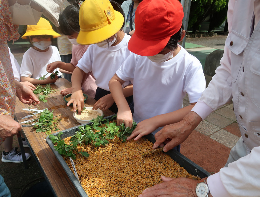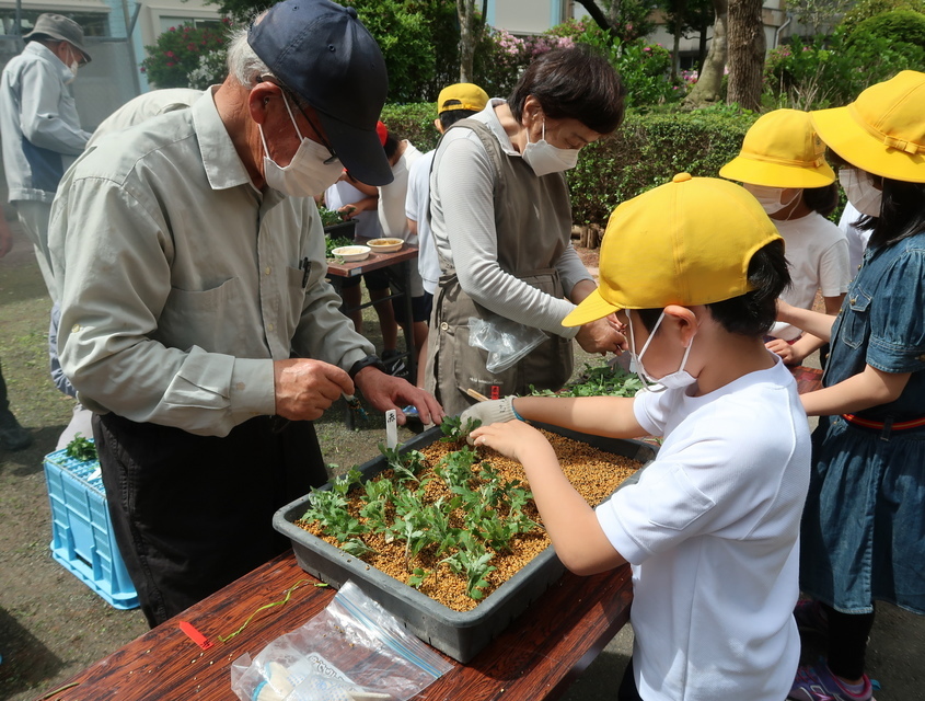 前日(4/26火)に、4年生が3年生のために、去年育てたざる菊から新芽を取り、発根剤に付けて準備してくれました そして恒例の引き継ぎ式!4年生から3年生へと菊の新芽を引継ぎました 3年生は、菊づくり愛好会の皆さんに教えてもらいながら一本一本丁寧に植えていきました。発根しやすいよう、天ぷらみたいに粉をつけて鹿沼土に挿す作業が楽しかったようで、「もっとやりたい」という声がたくさん聞こえてきました 放課後公民館に遊びに来た子から、お母さんに頼んで「夕食に天ぷらを作ってもらえることになった |