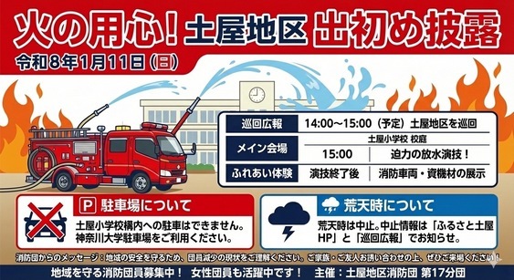 第17分団です。 今年も残すところあとわずかとなって参りました。 皆さんクリスマスの準備や大掃除すすんでいますか?? 本日は来年行う出初め訓練の告知をさせていただきます。 地域回覧板ではまわしていただきましたが、2026年は出初め訓練を土屋小学校、神奈川大学ご協力のもと、土屋小学校校庭で行います。 日程 1月11日 15時放水開始 お車でお越しの際は神奈川大学第1駐車場をご利用ください。 放水後はポンプ車や資機材を間近で見て触れられる触れ合いタイムもあります。 子供も大人も是非、足をお運び頂き、迫力ある放水をご覧下さい。 17分団では ☆ライトアップ、イルミネーションが好き、興味がある! 機械に詳しい! 地域の役に立ちたい! 興味がある! 子供にかっこい姿を見せたい!! 消防車に乗りたい! パソコンなどが使える! 手先が器用! など、どんなきっかけでも大丈夫! 一緒に活動できる「仲間」を募集しています あなたも是非一緒に活動してみませんか? #消防団 #消防団員募集 #平塚市 #平塚市消防団 #平塚市消防団第17分団 #消防 #火災予防 #住宅用火災警報器 #hiratsuka #hiratsukagood #firecorps #furusatotsuchiya #あったかひらつか |