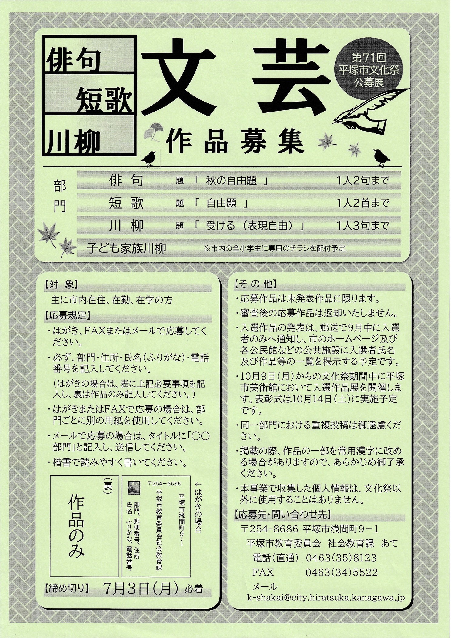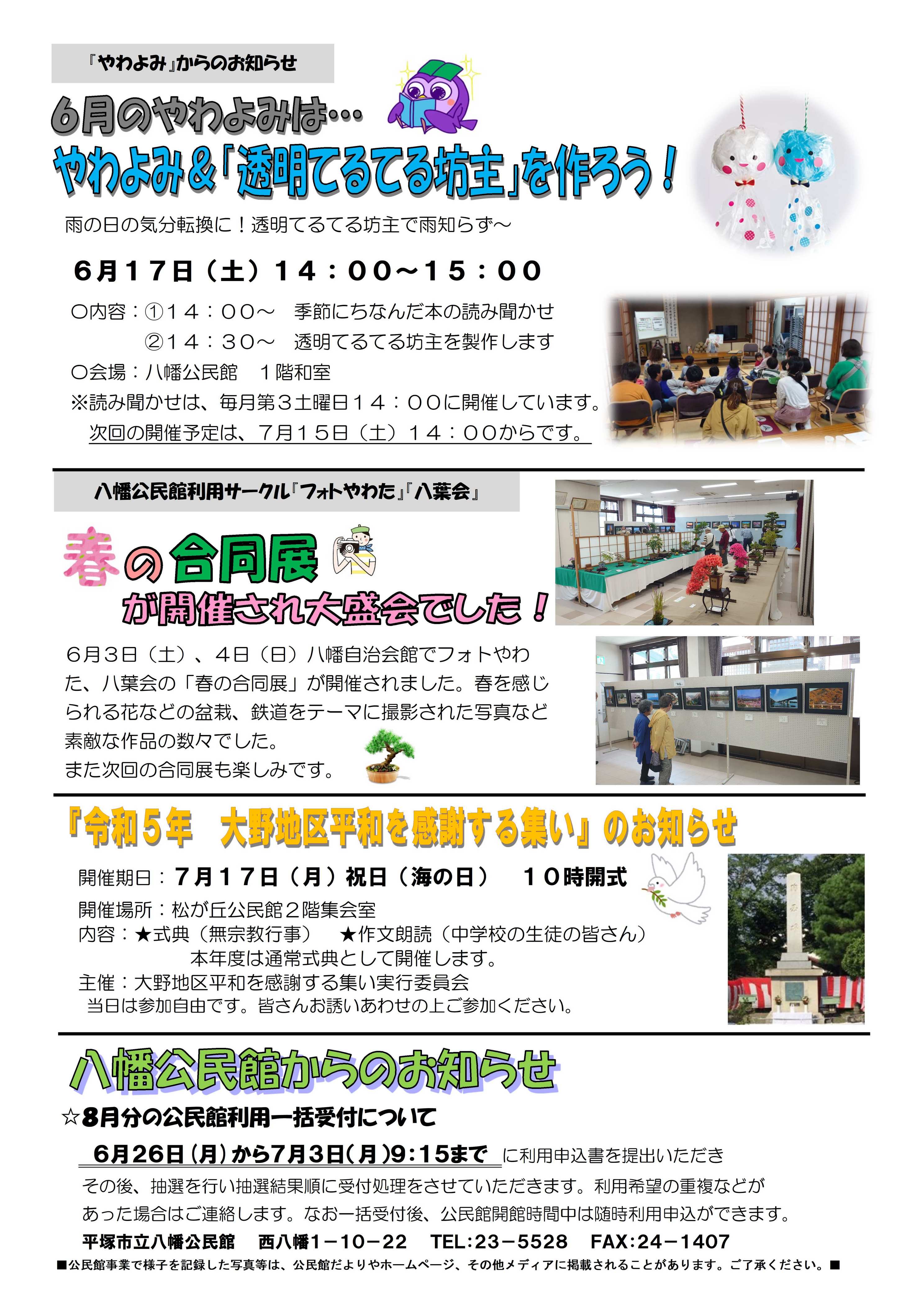 *ひらビあーつまれ メンバー募集 *ダンボール物語 *子ども家族川柳 *キャリア支援セミナー *第71回平塚市文化祭(文芸作品募集) *芸能合同公演(第71回湘南ひらつか七夕まつり協賛) *地震火山地質in平塚こどもサマースクール 第22回 ![]() ![]() ![]() ![]() ![]() href="http://hiratsuka.johokyoyu.net/area/yawata/yawata_Ext22442.jpg" id="ExtImg">![]() |