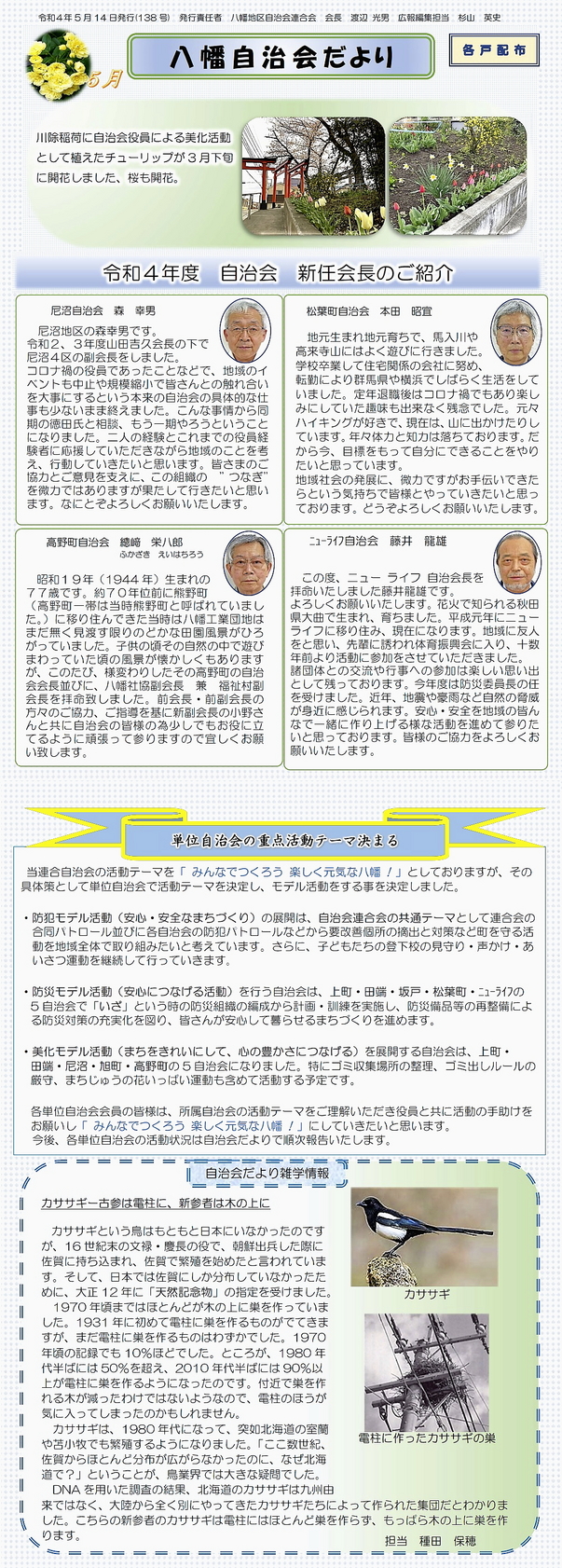 この地区は、東八幡1〜5丁目、西八幡1〜4丁目の地域が、旧名称の字名で8単一自治会から構成されています。
