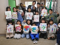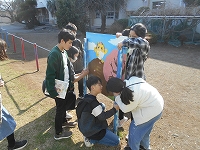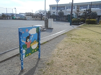 3/13の「”やわた”ちいき情報局」にも掲載したように、子どもたちが描き直した看板です。片面はイラスト、もう片面には「はだしの庭の使い方」がかかれています。 ネジ穴をあけて、支柱に固定しました。難しいところは、校務作業員の鶴岡さんに助けてもらいました。 | ||