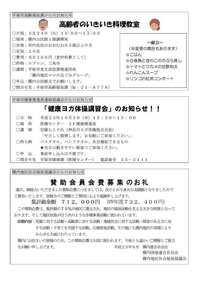 横内地区では町内福祉村の設立に向けた準備会を本年度から発足し、具体的な検討を開始し始めました。 地区の回覧板等を通じて、応募していただいた準備会メンバーは18人を数え、他地区での活動状況や横内地区での取り組みについての話し合いを行っております。 これを機会に、現在検討している福祉村活動について、お知らせいたしますとともに、名称を募集いたします! また、9月には、ボランティアの募集を予定しております。 本HP、自治会回覧板を通じて、お知らせいたしますので、今後ともよろしくお願いいたします。 |