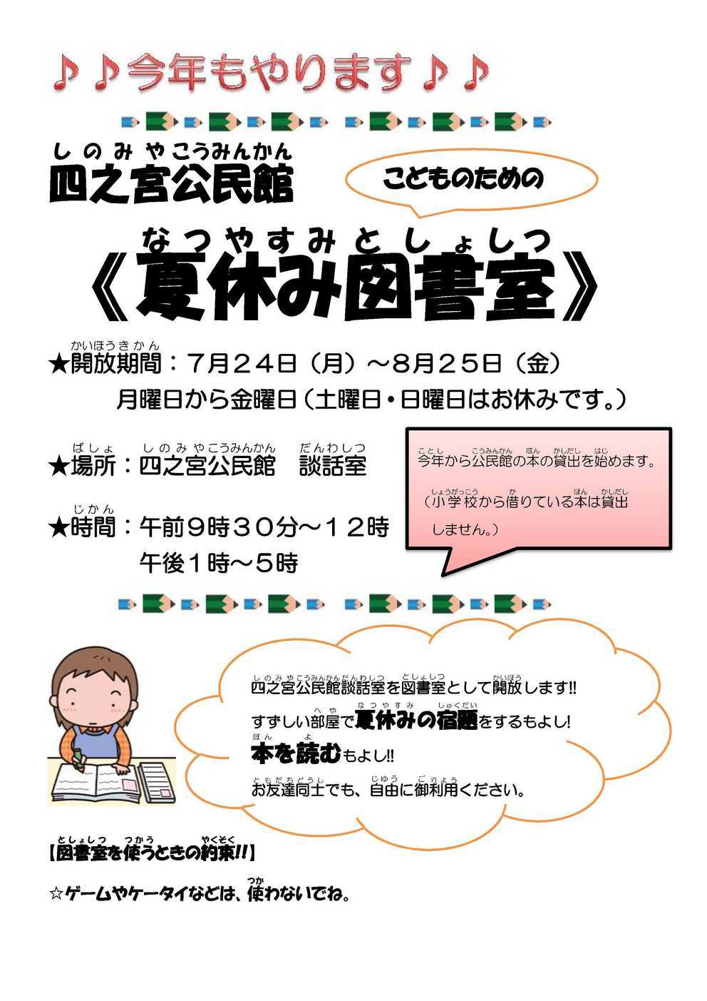 四之宮公民館 こどものための夏休み図書室・福祉村からのお知らせ