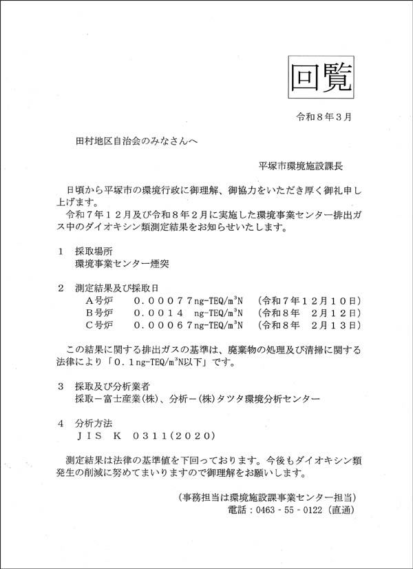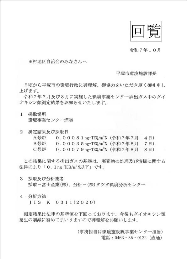 【回覧板】環境事業センター排出ガス中のダイオキシン類測定結果
