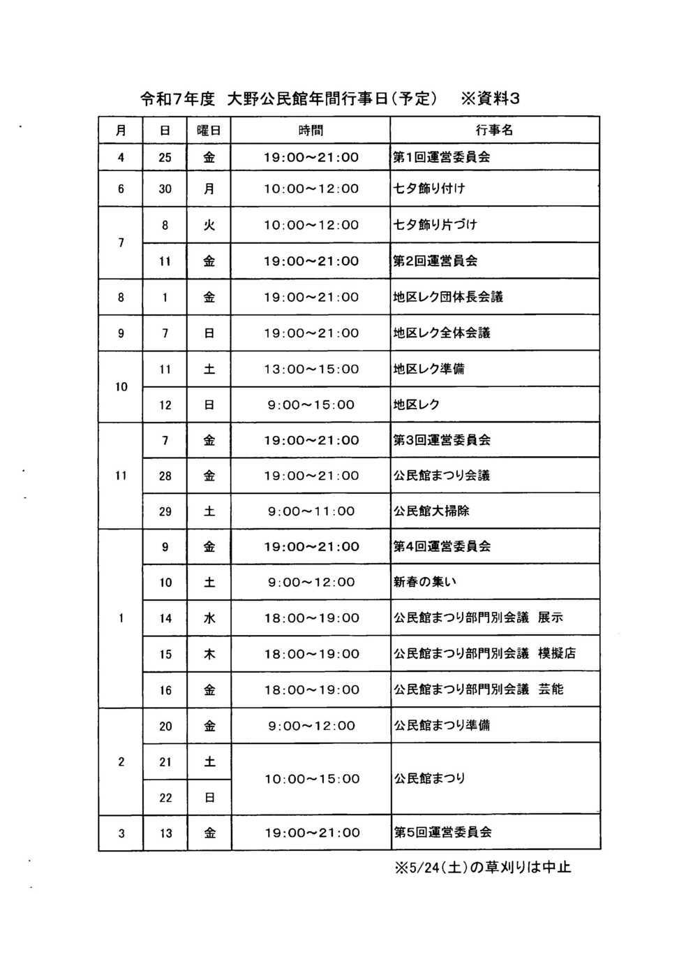 ※年間カレンダー 大野公民館年間行事日(予定) と 事業計画(7.11時点) 2025年