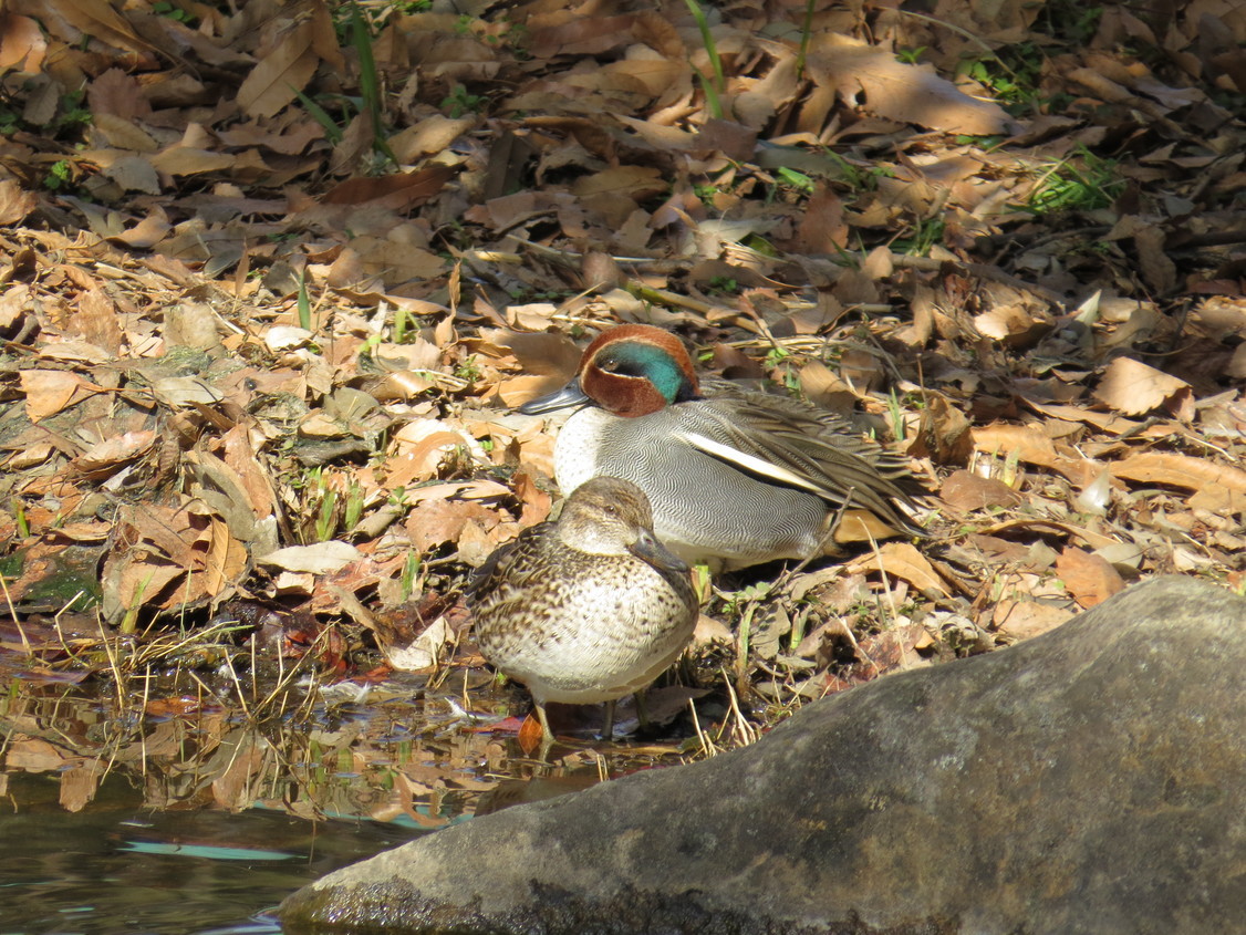 公園池に野鳥3種のつがいとアオサギ