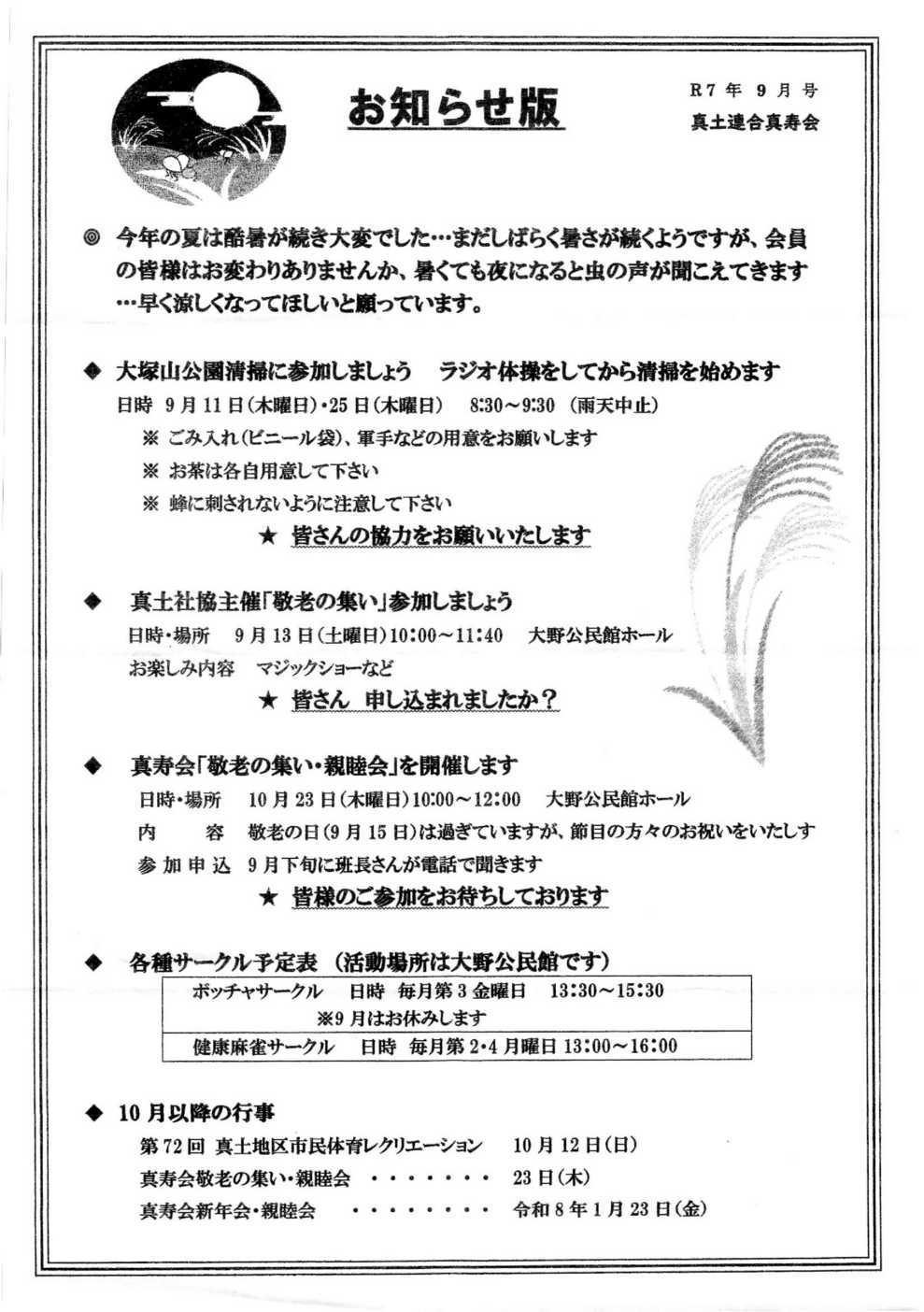 『お知らせ版』 真土連合真寿会 会員誌 令和7年9月号