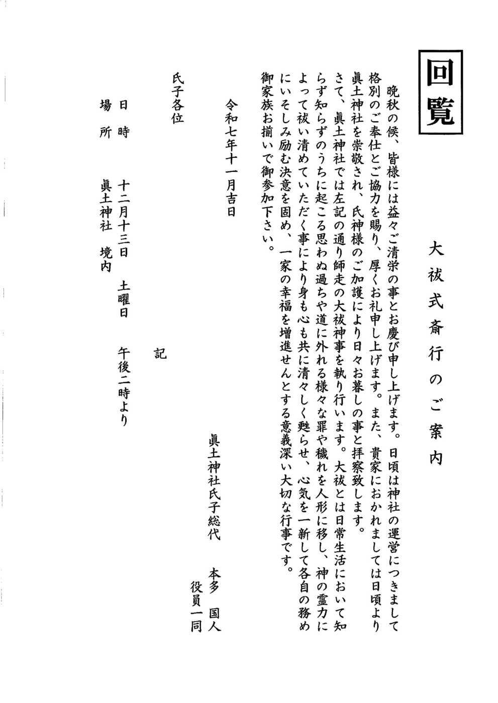 真土神社大祓式斎行 令和7年12月13日(土) 14:00 眞土神社境内