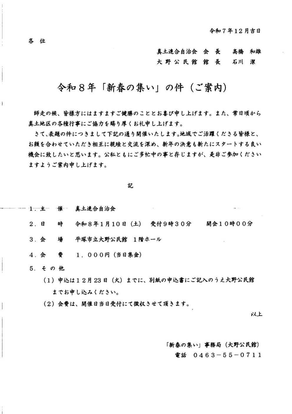 新春の集い 令和8年のご案内 令和8年1月10日(土) 受付9:30 開会10:00 大野公民館 1階ホール