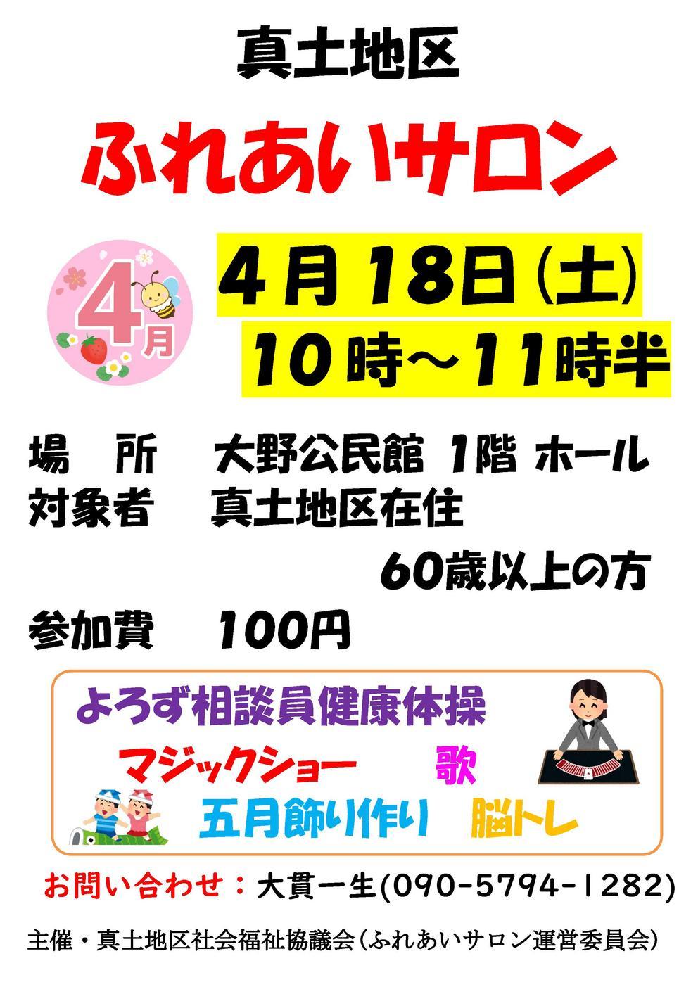真土ふれあいサロン 2026年4月開催のご案内 4月18日(土) 10時00分 ~ 11時30分 大野公民館 1階 ホール