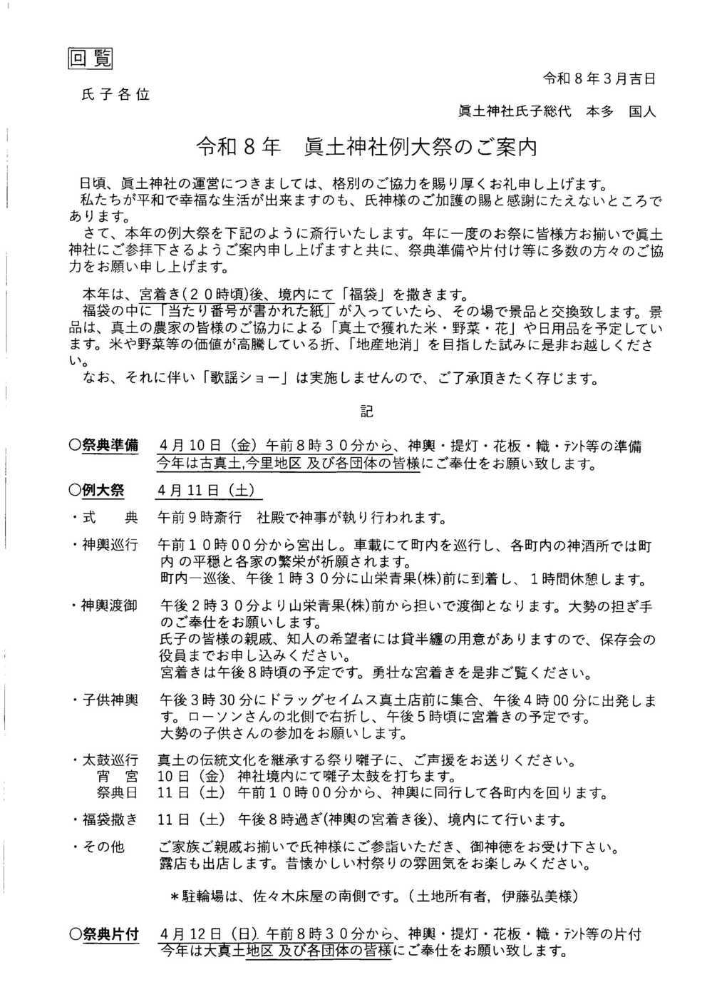 令和8年眞土神社例大祭のご案内 4月11日(土) 式典:午前9時斎行 神輿巡行:午前10時00分から宮出 神輿渡御:午後2時30分より 子供神輿:午後3時30分【回覧】