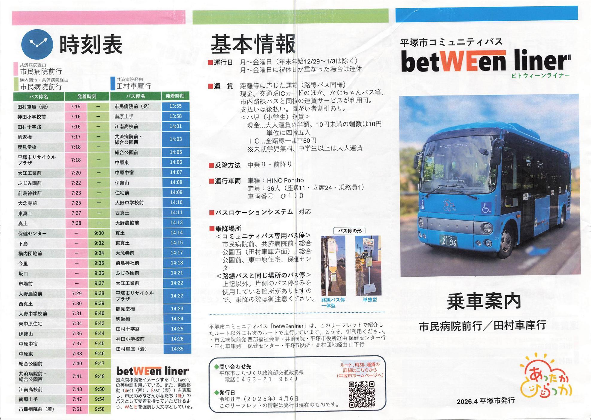 betWEen liner 乗車案内 真土ちいき周辺の停留所Ver 市民病院前行/田村車庫行 2026.4.6現在