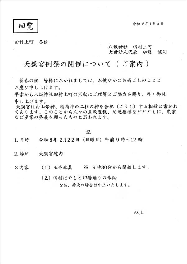 【回覧板】天獏宮例祭の開催について(ご案内)
